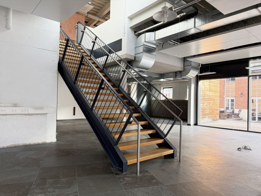 Die obere Etage mit ca. 110 m² Fläche ist über eine zweiläufige, geradlinige Wangentreppe erreichbar. Hier sorgt hochwertiges Echtholzparkett in Kombination mit einer überdurchschnittlich guten Belichtung für eine angenehme, helle Atmosphäre – ideal für Beratung, Ausstellung, Büro oder ergänzende Verkaufsflächen.