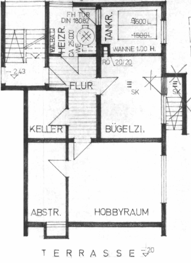 Das Gebäude ist voll unterkellert. Im Untergeschoss befinden sich ein Technikraum mit angrenzendem Tankraum (Öltank mit ca. 5.500 Litern), ein Bügelzimmer mit Anschlüssen für Waschmaschine und Trockner sowie Ausgussbecken, ein Kellerraum, ein Hobbyraum sowie ein Abstellraum. Weitere Abstellflächen stehen im Speicher zur Verfügung.