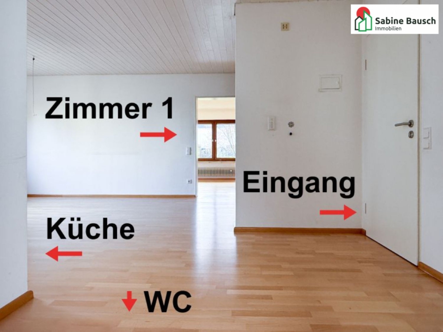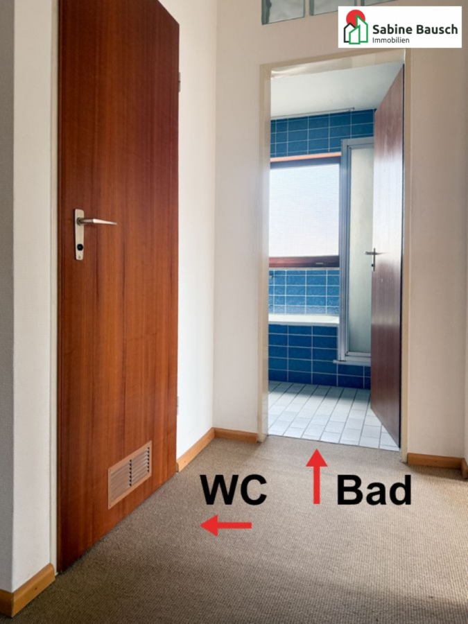 Die 23,68 m² große ELW ist sowohl über das Treppenhaus, als auch über eine Verbindungstüre, links von der Treppe im Obergeschoss zugänglich. Diese verfügt über einen Flur (ca. 5,46 m²) mit Möglichkeit zur Installation einer Küchenzeile, ein Tageslichtbad mit Dusche, Waschbecken und WC sowie ein Wohn- und Esszimmer mit ca. 15,10 m².