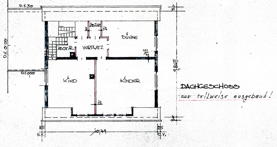 Im Obergeschoss ist die Raumaufteilung nahezu identisch. Hier gibt es jedoch keine Küche – allerdings ein Zimmer mit Anschlüssen für eine Küche. Somit stehen auf dieser, an sich eigentlich abgeschlossenen Etage, drei Schlafzimmer, eine Tageslicht-Toilette und ein zusätzlicher Raum (anstelle des Bads) zur Verfügung. Von diesem Raum aus führt eine Speicherklapptreppe zum Dachboden.
