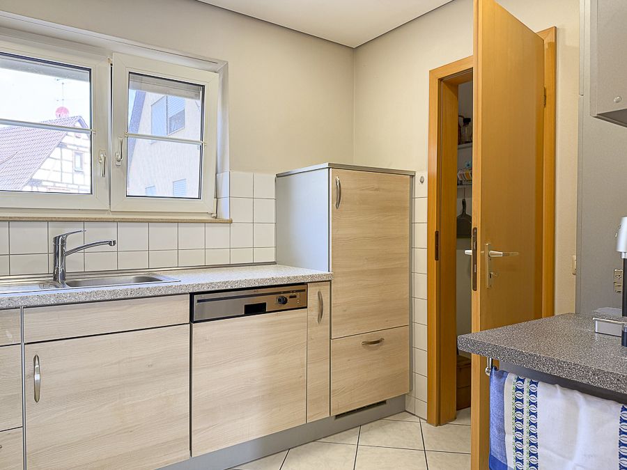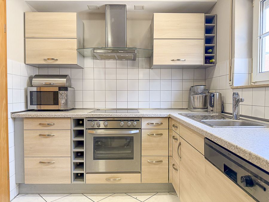 Im Obergeschoss steht eine freie 4,5-Zimmer-Wohnung mit 99 m² Wohnfläche zur Verfügung. Sie ist komplett gefliest und verfügt über eine Fußbodenheizung. Ein großzügiger Flur erschließt das Tageslichtbad mit Badewanne, Dusche, Waschbecken und Toilette sowie zwei Schlafzimmer. Weiterhin stehen ein Gäste-WC, ein zusätzliches Zimmer, die Küche mit Speisekammer und das große Wohn- und Esszimmer zur Verfügung. Die teilüberdachte Loggia mit Licht und Markise, ist vom Wohnzimmer und vom Zimmer 2 aus zugänglich. Die voll ausgestattete Küche mit Einbaumöbeln und Elektrogeräten ist praktischerweise vom Wohn- und Esszimmer aus zugänglich. Die Speisekammer grenzt direkt an die Küche.