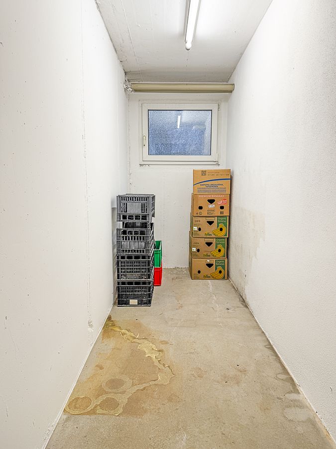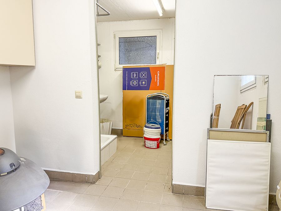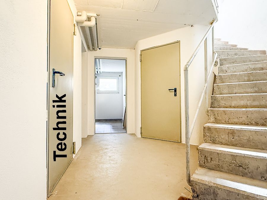 Das Untergeschoss ist sowohl direkt von der Gewerbeeinheit als auch über das Treppenhaus zugänglich. Von der Gewerbeeinheit aus erreichen Sie einen ca. 24 m² großen Lagerraum, einen Aufenthaltsraum mit etwa 8,8 m² sowie einen Wasch- und Umkleideraum mit ca. 6 m², in dem sich zudem ein Waschbecken und eine Dusche befinden. Darüber hinaus sind ein weiterer Lagerraum sowie der Technikraum direkt angeschlossen. Über eine Brandschutztüre gelangt man in das Treppenhaus. Dort befinden sich auf der linken Seite die beiden Abstellräume der Wohnungen sowie ein gemeinschaftlicher Waschraum.
